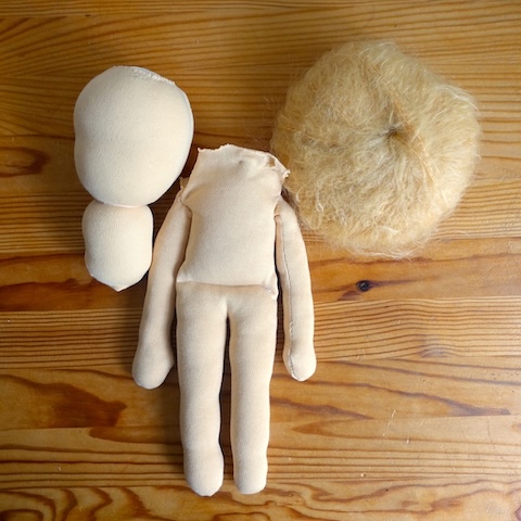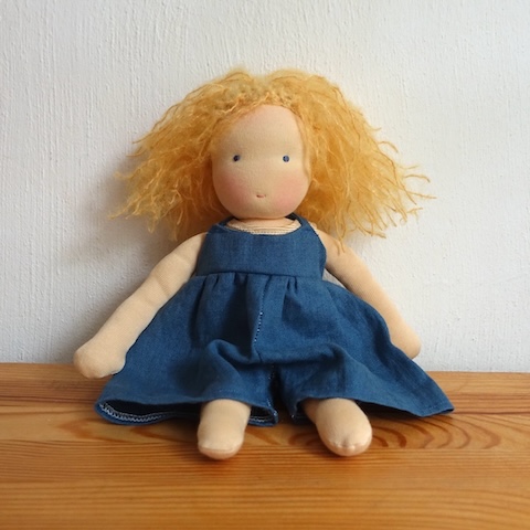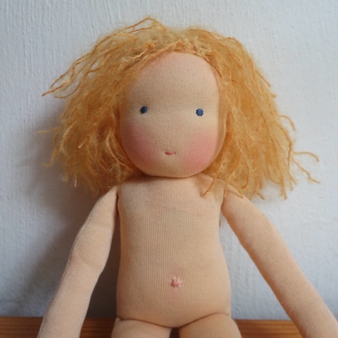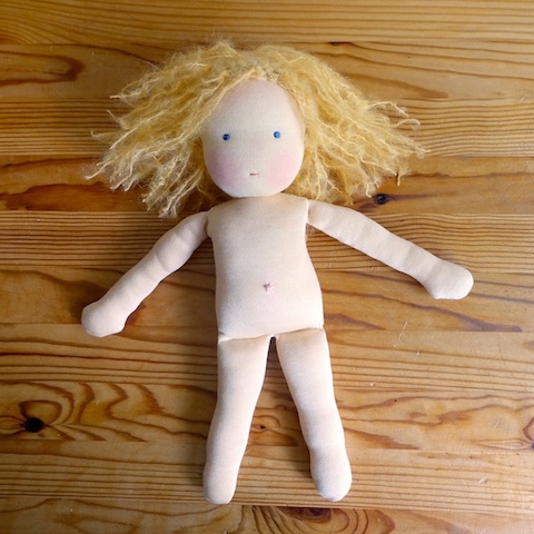 Auch das mache ich: Puppen beenden, die andere begonnen haben, und das sogar sehr gern, denn es ist zutiefst beglückend und zufriedenstellend, helfen zu können. Hier war es eine Kundin, die mit der Mitzi Anleitung und dem Mitzi Material aus meinem Shop eine Puppe machen wollte und auf halber Strecke nicht weiterkam. Das halbfertige Püppchen blieb wochenlang liegen, bis sie den Mut fasste, mich zu fragen, ob ich mir vorstellen könne, es fertig zu machen. Ja, das konnte ich.