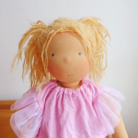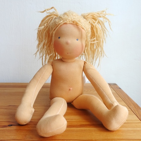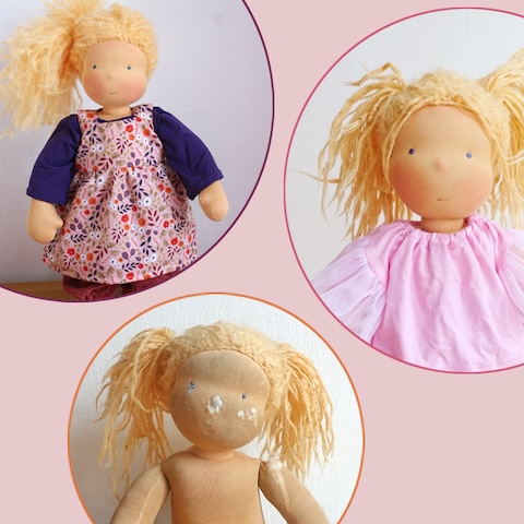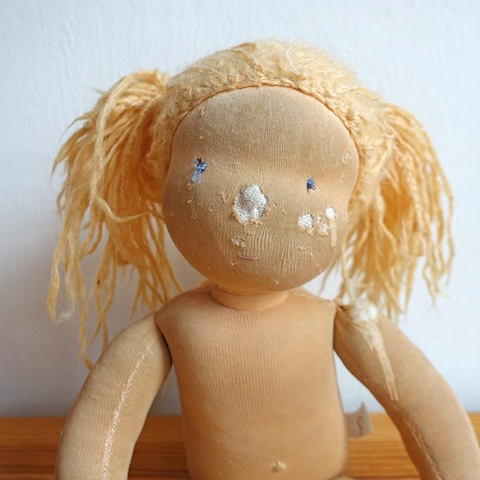 Ganz selten kommt es vor, dass auch mal eine Puppe aus meinen eigenen Händen in meine Reparaturwerkstatt zurückkommt. Wie Kami aus dem Jahr 2018, die von Kind und Katze sehr geliebt wurde und entsprechende Spuren menschlicher und tierischer Zuneigung zeigte. Ursprünglich war nur ein neuer Stoffbezug für den Kopf gewünscht, aber dann stellte sich auch der Körper als dermaßen zerliebt heraus, dass ich beherzt zu einer Generalüberholung riet. Letztlich blieben nur der rohe Kopf und die Haare, den Rest machte ich neu. Das hätte ich mich natürlich nicht getraut, wenn es nicht eine von mir selbst hergestellte Puppe gewesen wäre. So konnte ich aber gut einschätzen, dass die Reparatur ein Erfolg werden würde und so kam es auch: Kami ist wie neu und doch die Alte und freut sich auf viele weitere Spieljahre mit Kind und Katze.