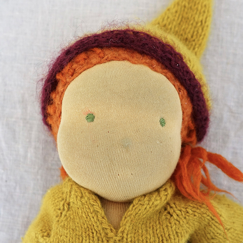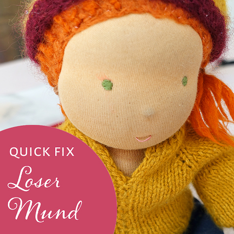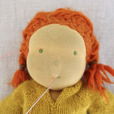 Den losen Mund entfernen. Mit zwei Stecknadeln die Mundwinkel markieren. Das Stickgarn als doppelten Faden auf eine lange Nadel ziehen und einen Knoten in das Ende machen. Von hinten durch den Kopf und vorne am ersten Mundwinkel ausstechen, den Faden vorsichtig straffen und dabei den Knoten im oder unter dem Haarkäppchen verschwinden lassen. Am zweiten Mundwinkel einstechen und am Hinterkopf wieder ausstechen und leicht spannen, damit der Mund straff am Kopf anliegt. Den Faden mit einem kleinen Knoten am Haarkäppchen fixieren, in den Kopf verstechen und abschneiden. Beide Knoten, von Beginn und Abschluss, werden wahrscheinlich nicht ganz unsichtbar werden, aber das lässt sich gut mit den Haaren kaschieren. Zuletzt noch schauen, dass die beiden Fäden am Mund nicht verzwirnt sind und ggf. sortieren, so dass sie sauber nebeneinander liegen (wie Ober- und Unterlippe).