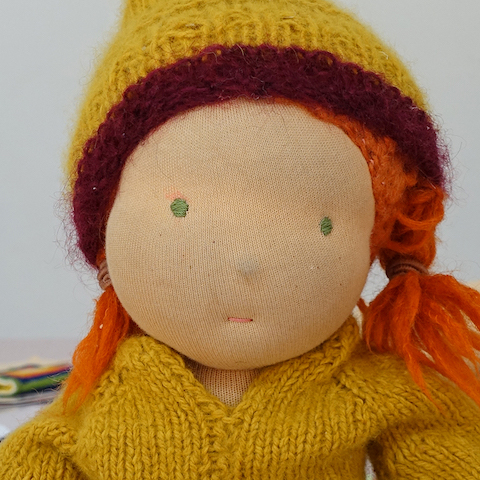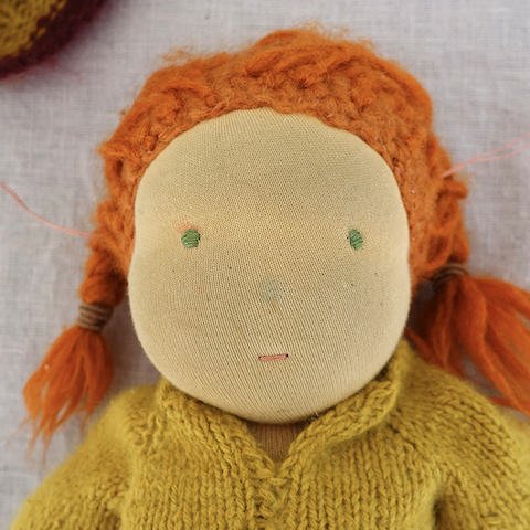 Manchmal kommt es vor, dass Teilnehmerinnen eine reparaturbedürftige Puppe mit zum Kurs bringen, manchmal sogar eine, die sie vor Jahren bei mir genäht haben wie diese von Lara. Sie hatte sie 2018 für ihr erstes Kind gemacht und nach fünf Jahren intensiver Bespielung und liebevollster Liebkosung hatte sich der gestickte Mund gelockert und stand als loser Faden vom Kopf ab. Ob die Zeit reichen würde, das zu reparieren? Ihre Tochter wäre überglücklich. Tatsächlich ist so eine Munderneuerung leichter als gedacht und dauert keine 20 Minuten. Alles, was man dafür braucht, ist ein bisschen Mut und eine entschlossene Gut-genug-Haltung:
