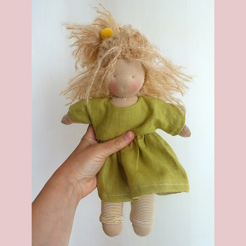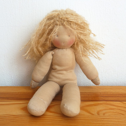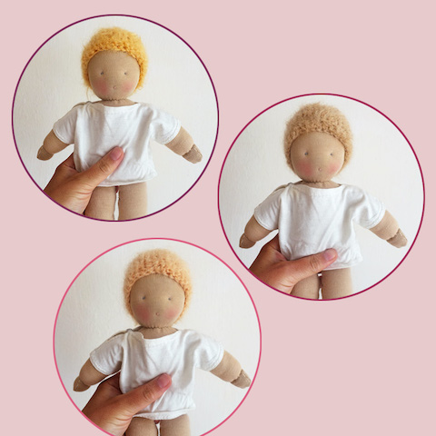 Dafür entfernte ich zuerst den alten aufgestickten Haarschopf mit Schere und Pinzette (was immer länger dauert, als man denkt). Dann flickte ich die offenen Stellen am Körper und bezog die Hände neu mit Stoff, denn der alte war dünn geworden und hatte schon Laufmaschen. Außerdem band ich den Hals noch einmal ab, damit er fester wurde und der Kopf mehr Kontur erhielt. Dann durfte die Familie eine neue Haarfarbe auswählen. Blond sollte es werden, nur welches genau? Auf dem Bild sieht man gut, wie unterschiedlich die drei verschiedenen Farbtöne wirken. Es wurde dann Strohblond, dazu gab es ein neues Kleiderset in Gelb und Grün und fertig war die neue Ronja.