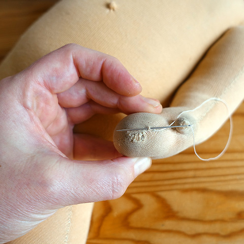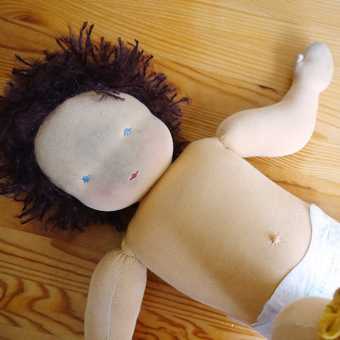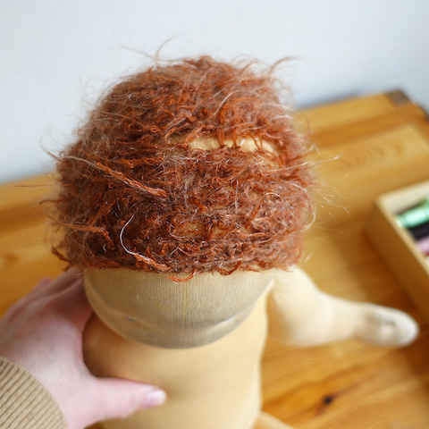 Puppe Tine brauchte neues Haar und einige offene Stellen mussten geflickt werden. Eigentlich brauchte sie auch dringend ein Bad, aber das wir mir zu heikel, denn der Mund war mit Farbe aufgemalt und ich wusste nicht, wie dieser auf Wasser reagieren würde. Für das Haar häkelte ich ich neues Käppchen (in einer andere Farbe) und knüpfte Strähnen ein, die offenen Stellen schloss ich mit dem Matratzenstich und etwas Wangenrot brachte neue Frische auf des zerliebte Gesicht.