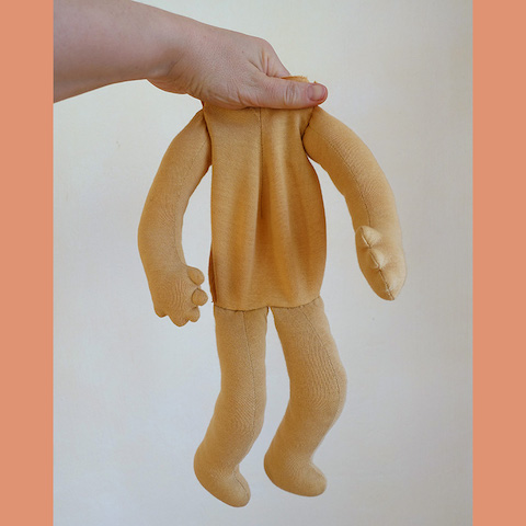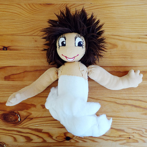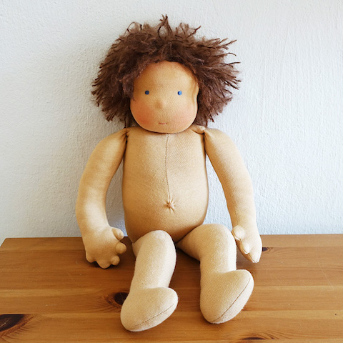 Vor Jahren hatte meine Kundin Melanie sich mit einem Handarbeitstauschgeschäft ihren Herzenswunsch nach einer Puppe nach Waldorfart erfüllt und diesen Clown erhalten, mit dem sie nicht so richtig glücklich war, von dem sie sich aber auch nicht trennen wollte. Mit der Zeit entstand die Idee, die Puppe zu verändern, und so kamen schließlich wir zusammen. Die rote Nase hatte sie schon aufgemacht, aber es durfte noch radikaler werden und ein neues Wesen mit einem völlig neuen Look entstehen.