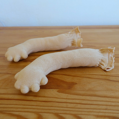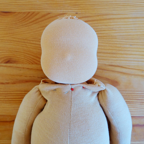 Zu diesem Zeitpunkt war ich noch recht unerfahren in Reparaturen dieser Art und bangte zugegebenermaßen, was mich erwarten würde, wenn ich den Kopf entfernte. Und tatsächlich, die Arme waren am Kopfunterteil befestigt, was die Sache etwas aufwendiger machte. Ich trennte sie ab und nähte sie stattdessen in den Rumpf ein. Dann kam die eigentliche Reparatur bzw. Umgestaltung: der neue Kopf. Melanie wünschte sich einen Puppenjungen und den bekam sie auch, dazu neue Kleidung und einen neuen Namen, Pelle, wie ich später erfuhr, nachdem sie ihn freudig in die Arme geschlossen hatte.