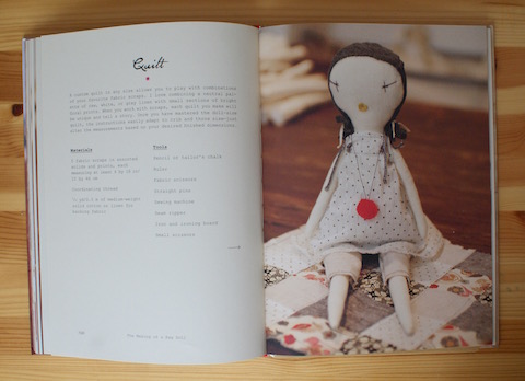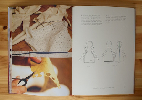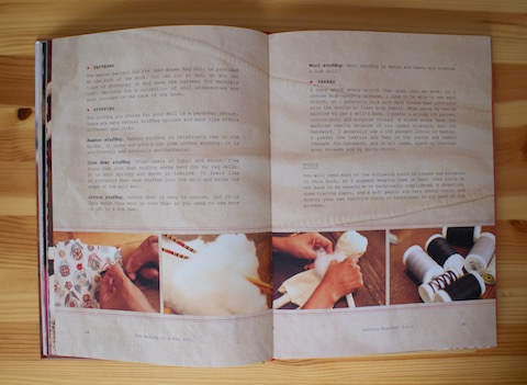 Jess Brown stellt diese Puppen nicht nur selbst her, sondern sie hat auch ein Buch darüber geschrieben. „The Making of a Rag Doll“ gehört zum Schönsten, was mein Bücherregal zu bieten hat: Hochwertiges Design, wundervolle Bilder, übersichtliches Layout, harmonische Gestaltung, schlichte Illustrationen, gut verständliche Texte – eine ganz feine, entspannte Anmutung, die bestens zu den Puppen passt. Es gibt eine Einführung über die Entstehung der Jess Brown Rag Dolls, Hinweise zu Material, Arbeitsutensilien und Techniken, eine ausführliche Begriffsübersicht für das Nähen, eine kleine Stoffkunde mit Tipps für die Schatzsuche auf dem Flohmarkt und natürlich eine Vielzahl an Projekten, darunter nicht nur die Puppe selbst, sondern auch Kleidung und Accessoires. Jess Brown mag es, wenn den Dingen anzusehen ist, dass sie von Hand gemacht wurden. Dabei wirkt aber nichts nachlässig, sondern immer sorgfältig durchdacht und ausgeführt. Das schlägt sich auch in den Anleitungen und Schnittmustern nieder. Alles ist ganz einfach und sehr gut auch für Anfängerinnen und Anfänger geeignet.