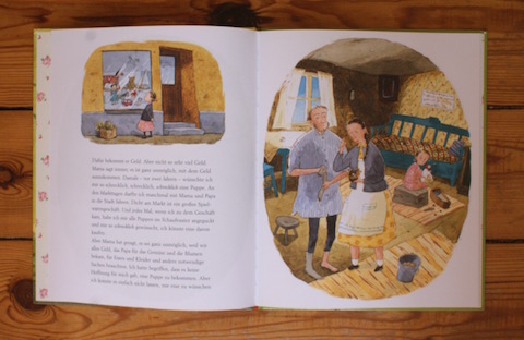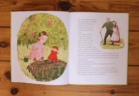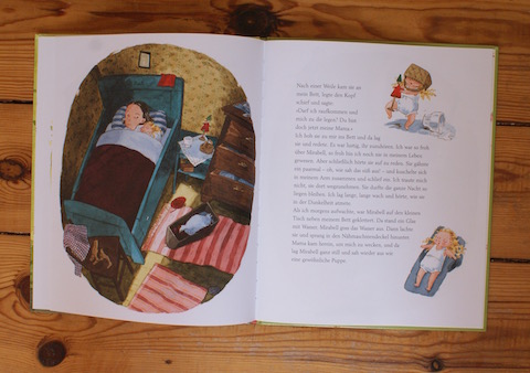 „Und da – genau in diesem Augenblick -, da schlug sie die Augen auf und guckte mich an. Sie hatte blaue Augen, genau wie ich es mir gedacht hatte. Ich hatte noch sie so eine wunderbare Puppe gesehen und konnte es nicht lassen, ich musste sie ein wenig streicheln.“