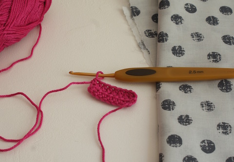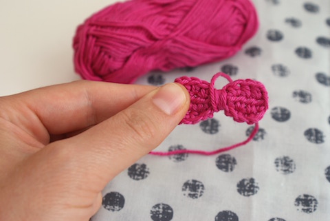8 Luftmaschen plus 1 Wendeluftmasche aufnehmen und 3 Reihen halbe Stäbchen oder feste Maschen häkeln, am Ende jeder Reihe eine Wendeluftmasche arbeiten. Den Faden abschneiden, durch die letzte Masche ziehen und vernähen, den Anfangsfaden ebenso. Für die Schleifenform das Rechteck fest abbinden, indem das Garn mehrfach um die Mitte gewickelt und fixiert wird. Für die Bänder einen ca. 8 cm langen Faden mit Hilfe einer Nähnadel auf der Rückseite so einfädeln und verknoten, dass die beiden Enden schön nach links und rechts fallen. Annähen und auf zum Picknick unterm blühenden Kirschbaum!