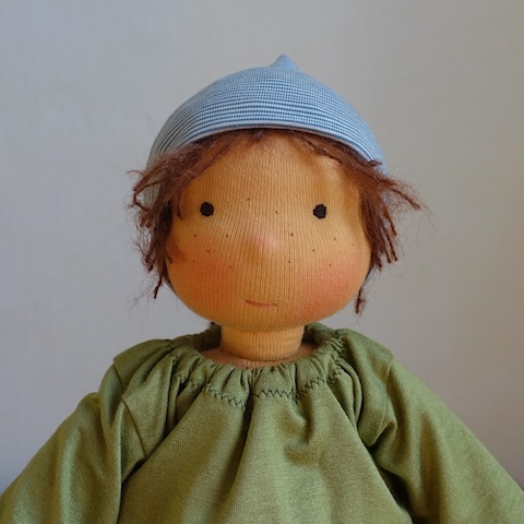 Mariengold Puppen werden von Hand mit großer Aufmerksamkeit und viel Liebe aus natürlichen Materialien und nach eigenen Entwürfen hergestellt. Sie haben einen kleinen Hals (die Babys und Minis jedoch nicht), einen einfachen Po, sehr gut bewegliche Arme und Beine, ein kleines Näschen und einen Bauchnabel, manchmal auch Ohren und Grübchen an Ellenbogen und Knien. Das Haar ist aus einer gehäkelten Perücke aus Mohair-Schurwoll-Garn mit eingeknüpften Haarsträhnen. Die Körperteile sind aus hochwertigem Schweizer Trikotstoff mit einem besonders reißfestem Garn genäht und sehr, sehr fest mit Schafwolle gestopft. Das Gesicht ist sorgfältig aufgestickt und die Wangen sind mit roter Bienenwachskreide eingefärbt. Die Kleidung ist aus Stoffen und Garnen aus Naturfasern. Puppen und Kleidung können von Hand mit lauwarmem Wasser und einem milden Waschmittel gereinigt werden.