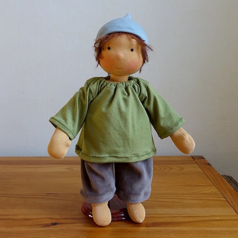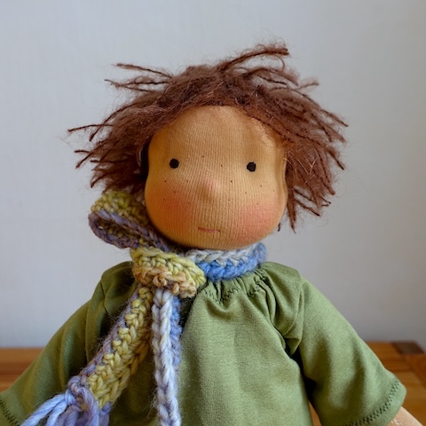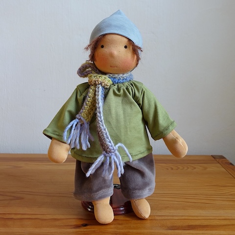 Fitz ist 30 cm groß, hat apricotbeige Haut, hellbraunes Haar, braune Augen und ein paar Sommersprossen im Gesicht und trägt ein olivgrünes Shirt, Hosen in Taupe, eine Ringelmütze in Blau und Weiß und einen Fransenschal im Farbverlauf Violett, Gelb, Hellblau.