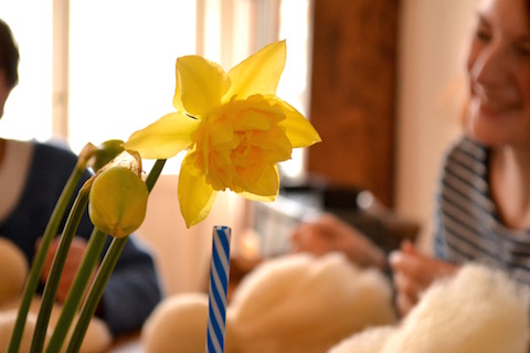 Unsere allhalbjährliche Befürchtung, in der Zwischenzeit das Filzen verlernt zu haben, bewahrheitete sich nicht. Ganz im Gegenteil, Laura und ich waren entspannt und fokussiert wie nie zuvor, die Zeit floss angenehm dahin und ohne ganz ohne Hektik, dafür mit viel Frühlingssonne und köstlicher Obsttorte, entstanden unter unserer Anleitung vier schöne Filzköpfe. Wir warnen die Frauen zu Beginn immer vor, der Kurs habe eher Werkstattcharakter und es brauche viel Geduld und Spucke, bis die Köpfe so werden wie gewünscht. Dieses Mal aber könnte jeder einzelne ohne weiteres zu einer kompletten Puppe weiterverarbeitet werden. So etwas macht Laura und mich natürlich auch stolz und glücklich.