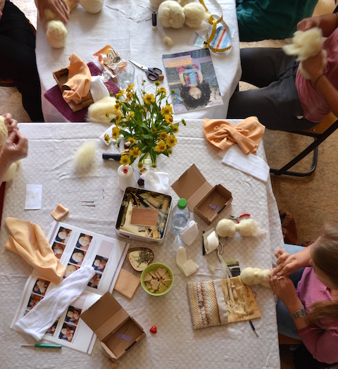 Tine hatte wieder ihren Weihnachtswichtel dabei, ein kleines Meisterwerk des mütterlichen Puppenerschaffens. Der fühlte sich pudelwohl zwischen den Kastanien und dem Blumenstrauß, die er sonst wohl nie zu Gesicht bekommt, weil er nur den Advent kennt. Auch die anderen mitgebrachten Puppen wurde geherzt und bewundert, angelacht und durch alle Hände gereicht. Es ist immer wieder ein Fest, diese Vielfalt zu sehen und die Freude der Frauen zu spüren, mit der sie an die neue Technik herangehen. Nicht immer kommt dabei ein perfekter Filzkopf heraus, aber darum geht es in unserem Kurs auch nicht. Vielmehr sehen wir ihn als Werkstatt, in dem nach Herzenslust probiert und experimentiert, gestaltet und gewerkelt, geschwatzt und auch geschmatzt werden darf, denn Kuchen und eine schöne Tasse Kaffee gehören bei uns immer dazu.