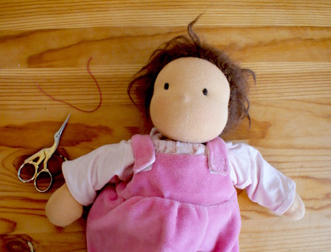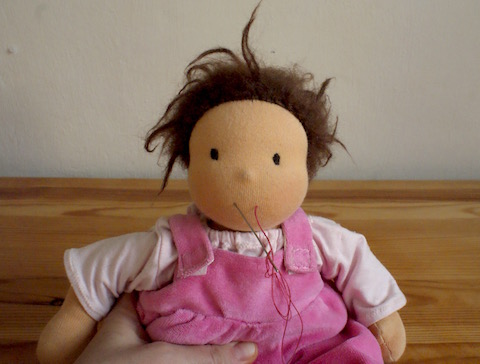 Das liegt in der Natur der Stoffpuppe: Wird sie bespielt, geherzt und geküsst, wird das Material mehr oder weniger stark beansprucht und die Puppe verändert sich. Konkret heißt das, die Füllung kann weicher werden, das Haar dünner, die Wangen blasser und Stickfäden können sich eben lösen. Das ist kein Zeichen von schlechtem Umgang, sondern ganz und gar natürlich, denn so eine Puppe besteht schließlich nicht aus unverwüstbarem Kunststoff, sondern aus textilen Materialien und wenn diese das ganze wilde Leben und ganz viel ungestüme Liebe mitmachen, zeugen sie früher oder später auch davon. Insofern sind diese Formen der Abnutzung im Gegenteil sogar ein gutes Zeichen, denn sie sind auch Lebensspuren und Liebesbeweise.