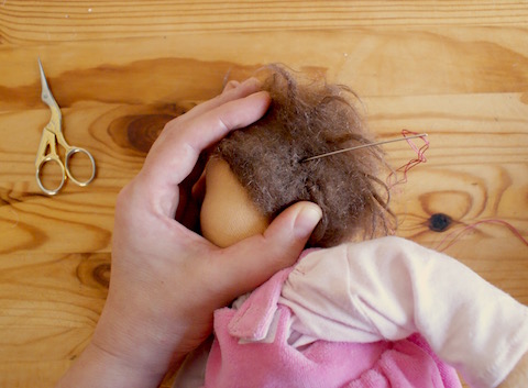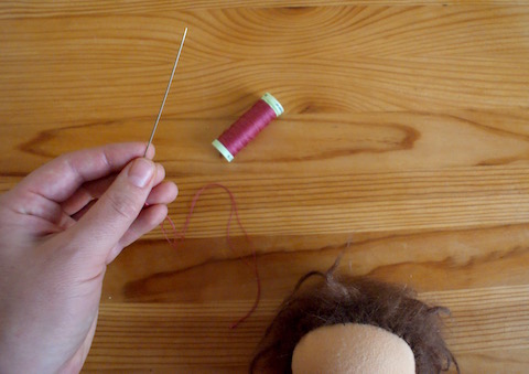 Je nach Kopfgröße einen ca. 40 cm langen Faden zuschneiden. Ich nehme ihn doppelt, deshalb schneide ich entsprechend mehr zu. Den Faden auf die lange Puppennadel nehmen und einen Knoten in das Ende machen. Damit der Faden gut fixiert werden kann, den Knoten etwas dicker, also doppelt oder dreifach machen.