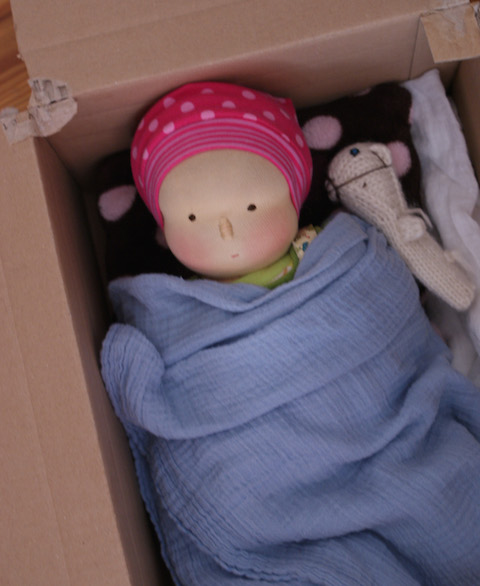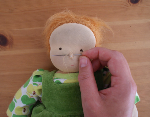 Für Yuki ist die Nasenreparatur übrigens auch gut ausgegangen, wie dieses Bild aus meiner Reihe „Mit Mariengold gemacht“ zeigt. Natalie hat ihrer dreijährigen Tochter gesagt, Yuki wäre beim Puppendoktor, und das Loch still und heimlich selbst gestopft. Nach dem Flicken trug die Puppe für für einen Tag ein Plaster, damit die Kleine sich innerlich auf das neue Gesicht einstellen konnte. Die Stickfäden sind für sie jetzt die Narbe und ihre Yuki hat sie genauso lieb wie vorher.