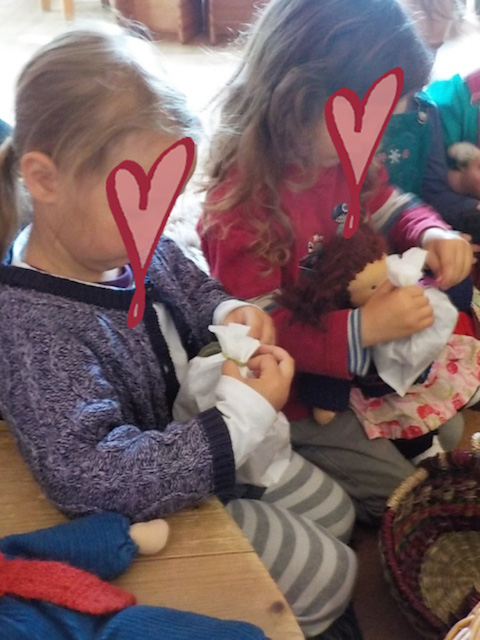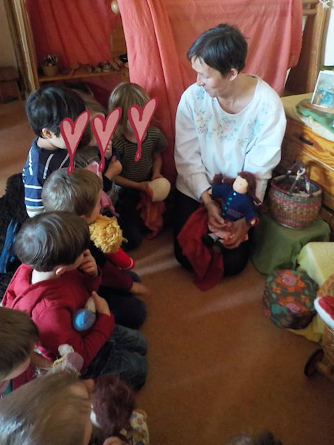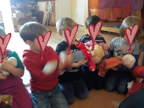 In der Begleitung des morgendlichen Ankommens konnte unsere Puppe Pauline manchmal Retter in der Not sein. Sie half bei der Ablösung der Kinder von ihren Eltern oder diente als Tröster, nachdem sich ein Junge nur im Streit von seinem Vater verabschieden konnte und weinend keine Ruhe fand. Erst war es die Murmel in seiner Hand und dann die Puppe in seinem Arm, die ihn wieder bei sich ankommen ließ. Einer unserer Vierjährigen ist immer am Beobachten, Fragen und Nachdenken zu allem was geschieht. Es fällt ihm sehr schwer, sphärisch einzutauchen und dem Spiel selbstvergessen zu folgen. Ich versuchte, ihm immer wieder unsere große Puppe mitzugeben. Doch die Hingabe ans Puppenkind gelang nur sporadisch.