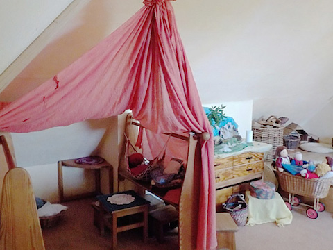 Übers Wochenende nahm ich den Himmel ab, besserte ihn an zahlreichen Stellen aus, verstärkte ihn, um ihn dann höher und durch eine Kordel gehalten an der Wand und über den Spielständern anzubringen. Die Spielständer wurden vertauscht, da sie aufgrund ihrer unterschiedlichen Größe auf diese Weise viel besser in die Ecke passten. Der neben dem Puppeneckchen stehende Jahreszeitentisch wurde ein Stück verschoben, so dass die beiden Spielständer nun in größerem Abstand die Ecke ausfüllen konnten. Das Puppeneckchen schien heller, weiträumiger, offener.