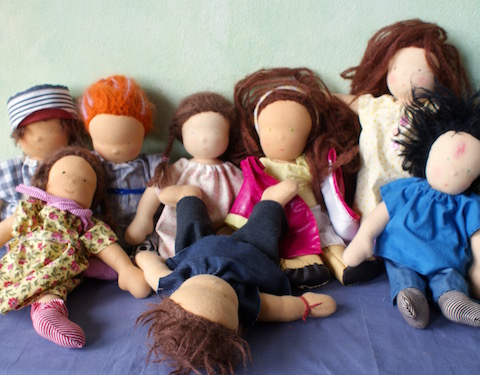 Von Januar bis März habe ich an einer Berliner Schule zusammen mit acht Mädchen und Jungen einer 6. Klasse eine Puppennäh-AG veranstaltet. An sechs Freitagnachmittagen drehte sich alles um die Herstellung der Puppen, an zwei weiteren Terminen nähten wir die Kleidung. Kurz vor den Osterferien war es geschafft, die Kinder hielten ihre fertigen Puppen in den Händen und strahlten mit ihren rotgewangten Goldstücken vor Glück um die Wette.