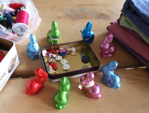 E. hatte die größte Freude an der Puppenkleiderschneiderei. Trotz Gipsarm vom Reitunfall brachte sie nach den Osterferien eine hübsche kleine Garderobe inklusive Regenmantel für ihre Puppe mit. Andere Kinder hatten vor den Ferien zwar meine Stoffvorräte geplündert – aber nichts damit angestellt. (Wie gut ich das von mir selbst kenne.)