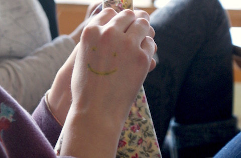 Einmal bekamen wir Besuch von der Handarbeitslehrerin. Es stellte ich heraus, dass die Kinder echt gute Tricks und Kniffe draufhaben, wenn sie nur jemand (die Handarbeitslehrerin) daran erinnerte, was sie bereits gelernt hatten. So konnte ich mir z. B. bei ihnen abgucken, wie man einen anständigen Knoten ins Fadenende macht.