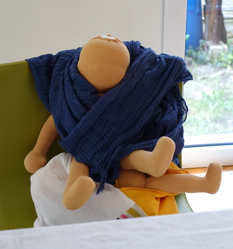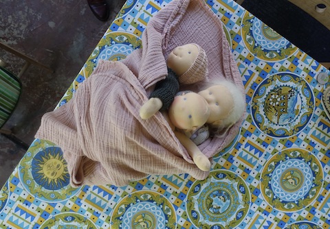 Und das war bei der Landpartie ganz schön viel: herrlichstes Maiwetter, nicht zu warm, nicht zu kalt, der üppigste, saftigste Garten, den man sich nur vorstellen kann, grüner Spargel, der vorwitzig aus dem Beet sprießte (und später auf unseren Tellern landete), pompöse Mohnblütenknospen kurz vor dem Aufplatzen, verschlungene Wiesenpfade, um sich darin zu verlieren, ein Haus und zwei Gastgeberinnen, die uns mit offenen Armen empfingen, liebevoll zubereitete Speisen, selbstgebackenes Brot mit einer unvergesslichen Gewürzmischung, warmer Haferbrei, der morgens vorzüglich den Bauch wärmte, unsere sechs Puppennähverliebten natürlich, eine davon weit aus der Schweiz angereist und eine andere, die uns das Geschenk machte, bei ihrem allerersten Mal Puppenmachen dabei sein zu dürfen, große Handarbeitsliebe an unserem Werkeltisch, Schwelgen in Gemeinschaftsglück, Lachen und Staunen, Schweigen und Genießen, Gespräche in einer Art Geheimsprache, von denen Außenstehende besser nichts mitbekamen, zwei Katzen, die immer im richtigen Moment auftauchten, um uns zu zeigen, wie herrlich man in der Sonne entspannen konnte, Häkelsessions unter freiem Himmel, zum Abschluss ein Mandala aus 15 einzigartigen Puppen, Abschiedsworte aus dem Herzen, feste Umarmungen und Tränen der Freude und des Berührtseins und nicht zu vergessen, Laura, mit der zusammen das alles doppelt so schön ist.