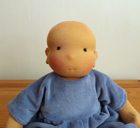 Mariengold Puppen werden von Hand mit großer Aufmerksamkeit und viel Liebe aus natürlichen Materialien und nach eigenen Entwürfen hergestellt. Sie haben einen kleinen Hals (die Babys und Minis jedoch nicht), einen einfachen Po, sehr gut bewegliche Arme und Beine, ein kleines Näschen und einen Bauchnabel, manchmal auch Ohren und Grübchen an Ellenbogen und Knien. Das Haar ist aus einer gehäkelten Perücke aus Mohair-Schurwoll-Garn mit eingeknüpften Haarsträhnen. Die Körperteile sind aus hochwertigem Schweizer Trikotstoff mit einem besonders reißfestem Garn genäht und sehr, sehr fest mit Schafwolle gestopft. Das Gesicht ist sorgfältig aufgestickt und die Wangen sind mit roter Bienenwachskreide eingefärbt. Die Kleidung ist aus Stoffen und Garnen aus Naturfasern. Puppen und Kleidung können von Hand mit lauwarmem Wasser und einem milden Waschmittel gereinigt werden.