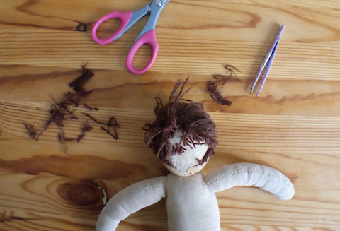 Haarsträhnen in der gewünschten Länge zuschneiden und mit der Häkelnadel in das Käppchen knüpfen. Zum Schluss die Strähnen mit der Schere zurechtstutzen, bei Bedarf einen Hauch Rot auf die Wangen geben und die Puppe in ihr neues frisch frisiertes Puppenleben entlassen.