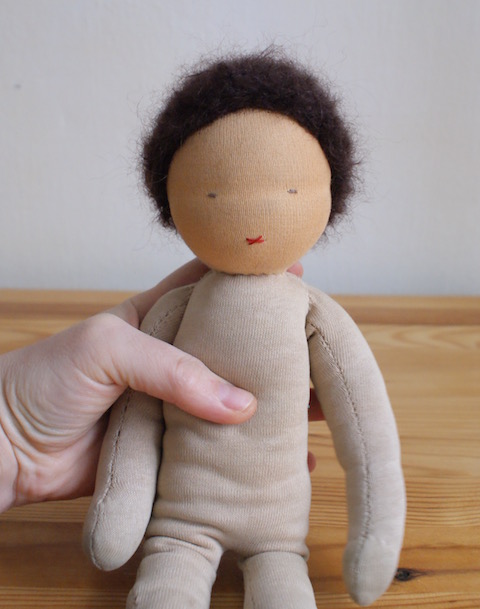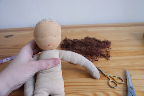 Wenn Puppen, die vielleicht aus einer längst vergangenen Kindheit stammen, ein zweites Leben mit dem Nachwuchs bekommen sollen, werden oft neue Haare gewünscht. Gerade ältere, traditionell hergestellte Waldorfpuppen haben in der Regel einen bestickten Schopf, bei dem das Haar mit Wollgarn und langen Stichen direkt auf den Kopf genäht wurde. Mit der Zeit haben sich meist einzelne Stiche gelöst und das Haar ist dünn geworden und sieht zerzaust aus. Klar, dass der neue Lebensabschnitt dann mit einer neuer Frisur eingeläutet werden soll.