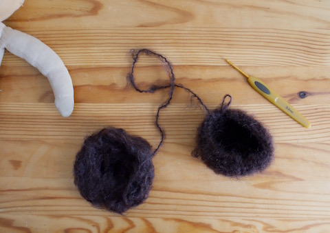 Aus dem Puppenhaargarn ein einfaches Käppchen häkeln, das eng und eher knapp auf dem Kopf sitzt. Wie genau das geht, findet sich z. B. in meinem Mitzi eBook und Baby Twink eBook. Auch die folgenden Arbeitsschritte werden dort ganz ausführlich erklärt, hier die Kurzversion für alle Handarbeitsversierten und Wagemutigen: