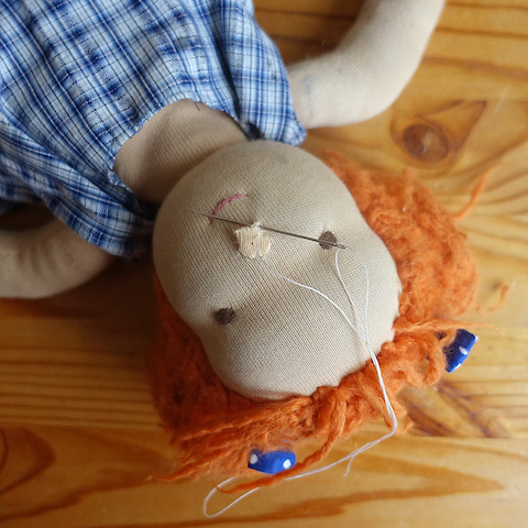 Und dann ist da noch etwas, das mir wichtig für die Puppen wichtig war: ihre Weste aus Schafwolle. Beim Kundalini Yoga ist es üblich, auf einem Schaffell zu sitzen. So ein Schaffell ist nicht nur weich und warm, sondern sein Geruch hat auch etwas Urtröstliches. Ich mag die Vorstellung, dass die gute Schafwolle nicht nur im Inneren der Puppen steckt, sondern sie diese mit ihrer Weste auch als stärkendes Schild nach außen tragen.