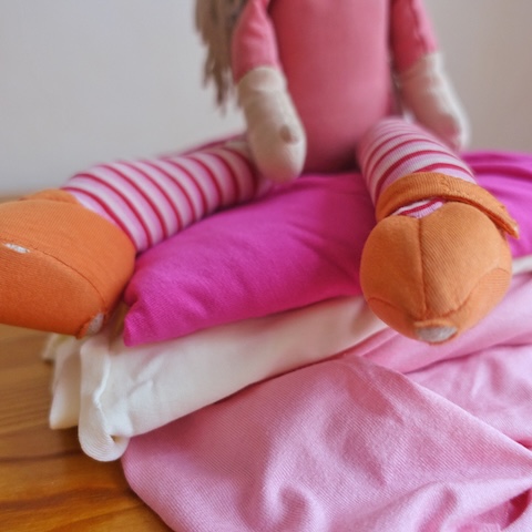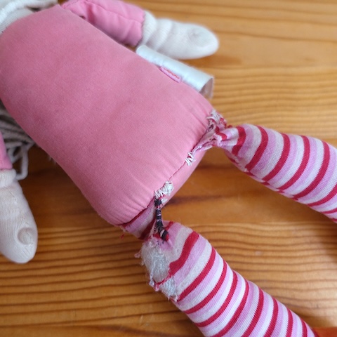 HABA-Puppe Ernie war schon einmal vor anderhalb Jahren bei mir in der Reparatur, damals ging es um ihre Arme. Dieses Mal waren es die Beine, die geflickt werden sollten.