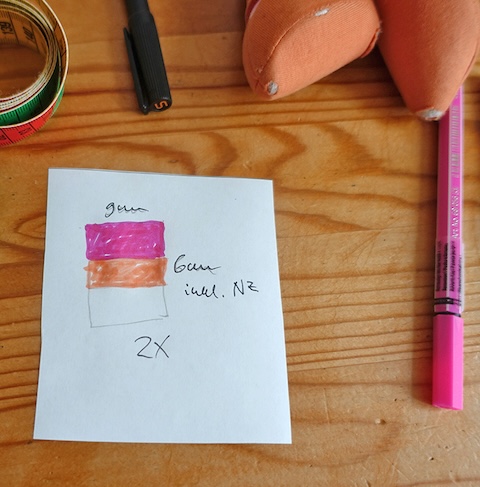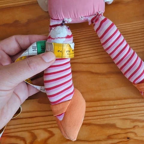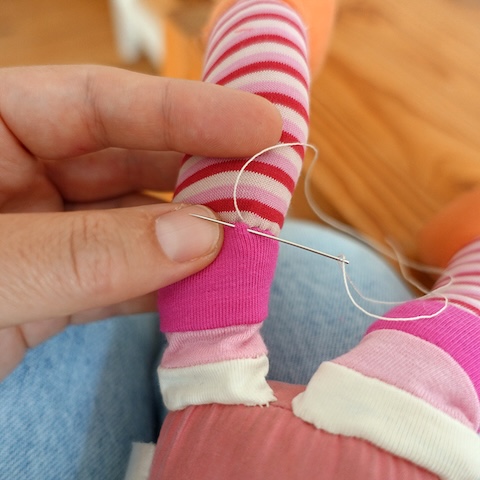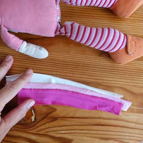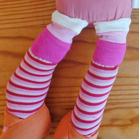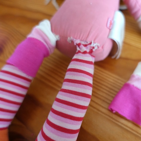 Der dünne Stoff war zerschlissen, was nicht schön aussah, aber an sich hielten die Beine noch gut am Rumpf. Deshalb beschloss ich, die Oberschenkel einfach neu mit Stoff zu beziehen und zu verstärken und dabei die offenen sowie die bereits notdüftig geflickten Stellen zu überdecken. Für längere Haltbarkeit hätte ich gern etwas festeren Stoff genommen, aber damit es gut zum Rest passte, entschied ich mich für Baumwolljersey und natürlich wieder für Streifen bzw. Blöcke, die ich selbst anfertigte. Dafür nahm ich an der Puppe Maß und nähte die Stoffstreifen entsprechend zusammen. Aus den Streifen machte ich Schläuche, zog sie in einem Kraftakt über die großen Füße und befestigte sie im Matratzenstich an Rumpf und Oberschenkeln. Ursprünglich hatte ich vor, die Stellen noch etwas mit Wolle zu füllen, aber das wäre beulig geworden, deshalb ließ ich es, wie es war und erfreut mich stattdessen an den schön schlenkerigen Beinen und fand, dass das gut zu Ernie passte.