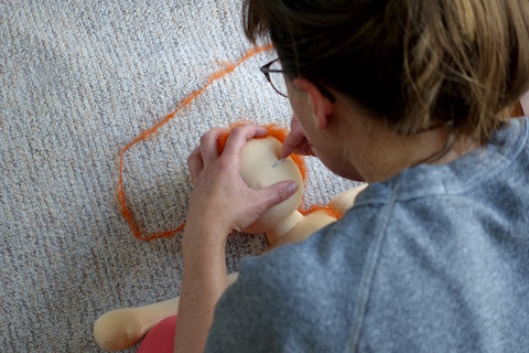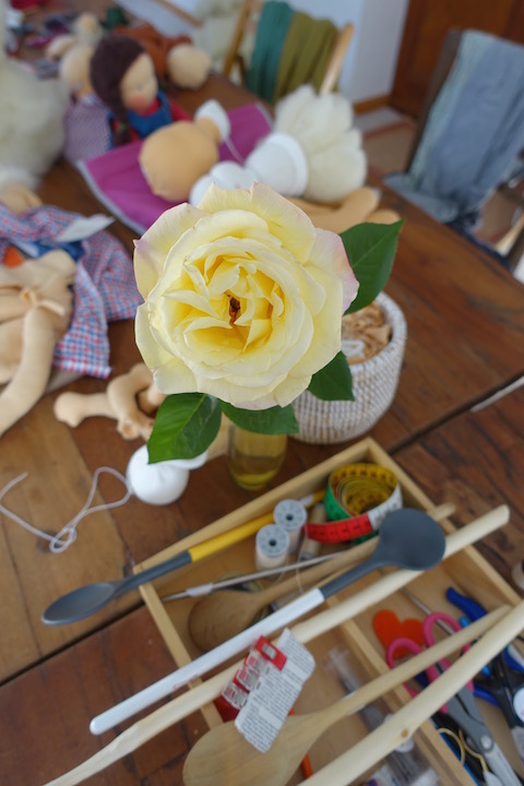 Begonnen hatte sie in Berlin auf der Bergengrünstraße, wo ich wohne, und wo wir Koffer und Taschen, Puppen, Material und Arbeitsutensilien, darunter sieben Kilogramm Stopfwolle, meterweise Stoff und eine Nähmaschine in mein kleines Auto luden. Mit dabei war eine einzelne gelbe Rose, die Laura aus ihrem Hofgärtchen im Prenzlauer Berg mitgebracht hatte, und die den Trip zu mir nach Zehlendorf aufgrund der hochsommerlichen Temperaturen trotz wässriger Vasenbehausung nur leidlich überstanden hatte. Ihre Blütenblätter waren ganz schlapp und erschöpft ließ sie ihren Kopf hängen. Auf mich machte sie überhaupt nicht den Eindruck, dass sie die Fahrt nach Wiesenburg überleben würde, weshalb ich sie am liebsten sofort auf dem Kompost entsorgt hätte. Aber nicht mit Laura! Sie bestand darauf, das Blümchen mitzunehmen, quasi auf dem Schoß zu transportieren und später im Wasserbad aufzupäppeln, damit es uns in den kommenden Tagen beim Puppennähen erfreuen könnte. Und so geschah es. Kaum im Refugium angekommen, hatte Laura schon eine Schüssel mit Wasser organisiert, in der die Rose langsam aufatmen und sich wieder in voller Pracht entfalten konnte. Was für ein rührender Anblick und wie unangenehm die Scham darüber, dass ich ihr keine Chance geben und sie einfach wegwerfen wollte. Und tatsächlich, kurz bevor unsere Teilnehmerinnen am späten Nachmittag eintrafen, war unser Raum picobello eingerichtet und auf dem Tisch blühte über allem diese starke, schöne und lieblich duftende Rose, der die Strapazen der Anreise überhaupt nicht mehr anzusehen waren.