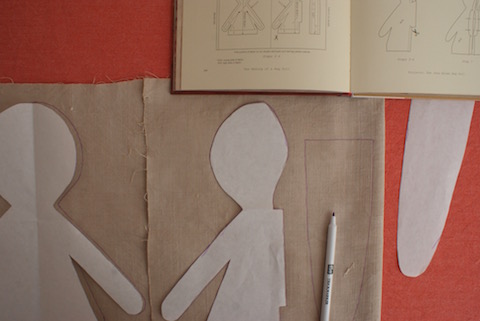 Neben dem Färben des Stoffes war ein weiterer Teil der Vorbereitungen das Übertragen des Schnittes aus dem Buch auf Papier und auf den Stoff. Dafür habe ich den Schnittmusterbogen mit Klebeband am Fester befestigt und die Konturen mit Bleistift auf Papier übertragen. Ab damit auf den Stoff, die Teile angezeichnet, ausgeschnitten und genäht. Im Anleitungsbuch sind diese Arbeitsschritte ausführlich beschrieben. Da steht auch, dass Jess Brown zum Nähen der Teile mit der Nähmaschine dunkles Garn verwendet, weil sie gern jeden Stich auf dem Stoff sieht. Auch wenn ich es anders gemacht habe, finde ich dieses kleine Detail nur konsequent, denn der Kontrast trägt genau zu jenem antiken Look bei, den sie sich für ihre Puppen wünscht. Jess Brown empfiehlt auch die Verwendung von Nähmaschinengarn aus reiner Baumwolle. Das konnte ich mir für den dicken, robusten Stoff nicht vorstellen und habe stattdessen das bewährte Nylbond von Coats verwendet, das ich auch zum Nähen der Teile für meine Mariengold Puppen nehme.