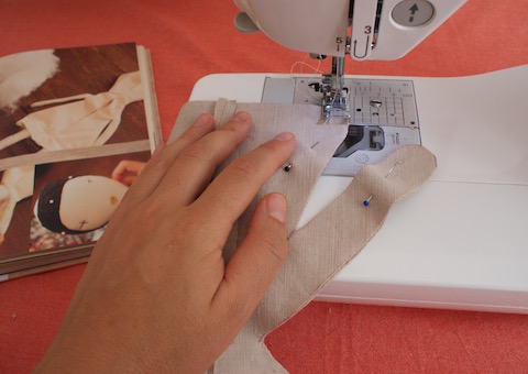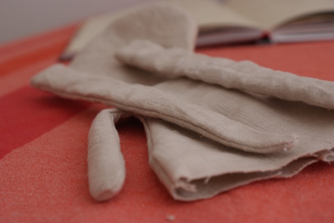 Die erste große Herausforderung war das Wenden der Teile von links auf rechts. Leinenstoff ist ja nicht flexibel. Hinzu kommt, dass die Arme und Beine sehr dünn sind. Das macht diesen Arbeitsschritt recht kniffelig. Was habe ich geflucht! Bis mir eine Idee kam, wie es gehen könnte – und es funktionierte tatsächlich. Meine Spezialmethode ist ziemlich kompliziert, deshalb versuche ich erst gar nicht, sie hier zu erklären. Zudem glaube ich auch, dass es einfachere Wege oder ein Zauberwerkzeug gibt. Wenn ihr mehr wisst, immer her damit.