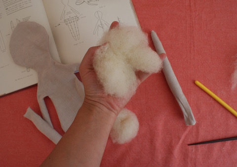 Weiter ging es mit dem Stopfen. Auch hier erwies sich der feste Stoff als Erschwernis im Vergleich zum gewohnten dehnbaren Puppentrikot. Vor allem bei den Armen und Beinen war es hilfreich, mit kleinen Stücken Wolle zu arbeiten. Das hat zwar ziemlich lange gedauert, aber die Füllung der Teile ist schön gleichmäßig und fest geworden. Zum Stopfen habe ich Schurwolle am Vlies verwendet, mein Lieblingsmaterial auch für die Mariengold Puppen. Jess Brown dagegen bevorzugt „corn fiber stuffing“, zu Deutsch Maisfaser. Diese beschreibt sie als elastisch und dicht zugleich in ihrer Struktur, als „old-world fiber“, mit der ihre Puppen über die Jahre bestens in Form bleiben. Könnte ich vielleicht auch einmal ausprobieren.