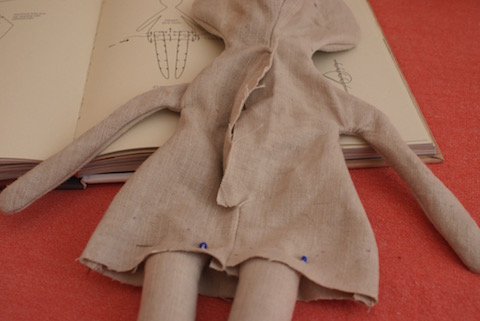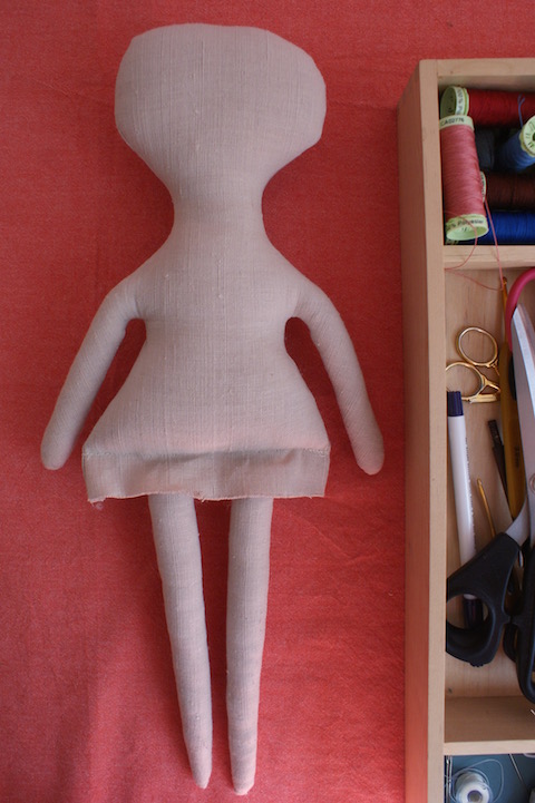 Das Stopfen der Teile und Zusammennähen der Puppe geht Hand in Hand. Zuerst habe ich die Beine gestopft und mit der Nähmaschine am Hauptteil befestigt. Dann kamen die Arme und der Kopf dran und zuletzt der Rumpf. Gestopft wird durch eine Öffnung am Rücken, die ich zum Schluss von Hand im Matratzenstich geschlossen habe. An dieser Stelle arbeitet Jess Brown mit dem überwendlichen Stich, der im Gegensatz zum Matratzenstich eine sichtbare Naht hinterlässt. Das hat sicher wieder mit dem handgemachten Look zu tun, den sie so mag.