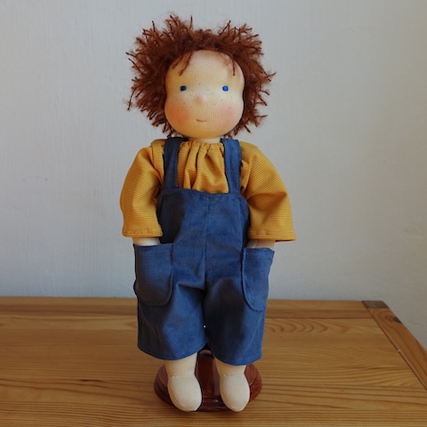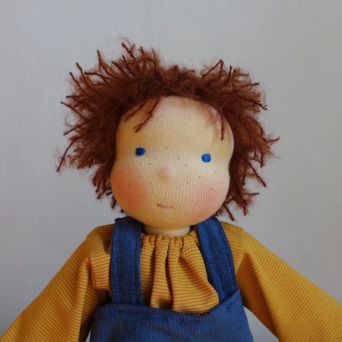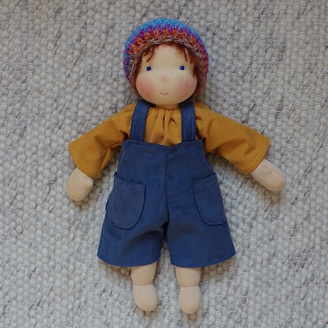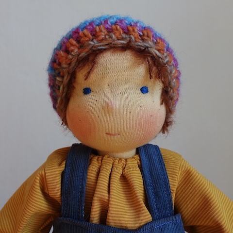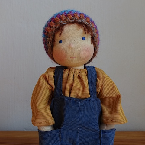 Ravi ist 30 cm groß und hat hellbeige Haut, rotbraune Haare, leuchtend blaue Augen und ein paar Sommersprossen im Gesicht. Er trägt dunkelblaue Cord-Latzhosen mit zwei großen Taschen, ein Ringelshirt in Senfgelb und Ocker und eine Mütze im Farbverlauf Türkis, Blau, Rostrot.