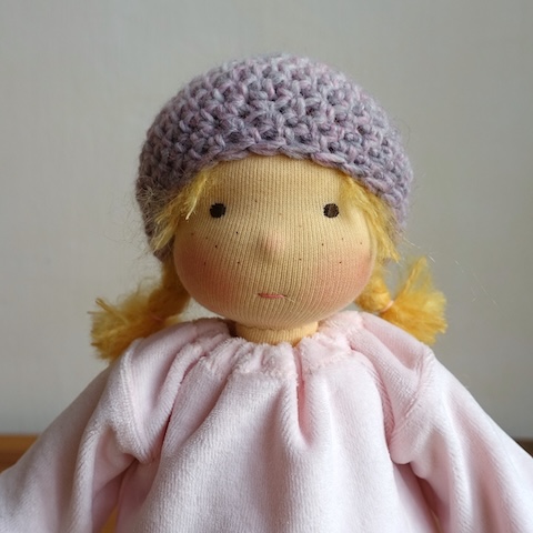 Mariengold Puppen werden von Hand mit großer Aufmerksamkeit und viel Liebe aus natürlichen Materialien und nach eigenen Entwürfen hergestellt. Sie haben einen kleinen Hals (die Babys und Minis jedoch nicht), einen einfachen Po, sehr gut bewegliche Arme und Beine, ein kleines Näschen und einen Bauchnabel, manchmal auch Ohren und Grübchen an Ellenbogen und Knien. Das Haar ist aus einer gehäkelten Perücke aus Mohair-Schurwoll-Garn mit eingeknüpften Haarsträhnen. Die Körperteile sind aus hochwertigem Schweizer Trikotstoff mit einem besonders reißfestem Garn genäht und sehr, sehr fest mit Schafwolle gestopft. Das Gesicht ist sorgfältig aufgestickt und die Wangen sind mit roter Bienenwachskreide eingefärbt. Die Kleidung ist aus Stoffen und Garnen aus Naturfasern. Puppen und Kleidung können von Hand mit lauwarmem Wasser und einem milden Waschmittel gereinigt werden.