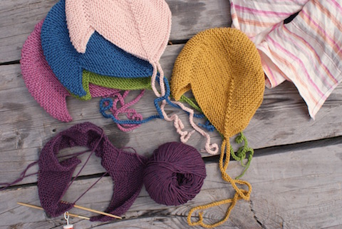 Meine liebstes und immer allereinziges Handarbeitsprojekt in den Ferien ist das Glückshäubchen. Ich liebe dieses kleine, feine Mützchen mit den drei Zacken an der Stirn und an den Ohren, das ich zuerst für meine Tochter gestrickt habe und seitdem für jedes neugeborene Kind in der Familie und im Freundeskreis anfertige. Es ist nicht nur das superniedliche Modell, für das mein Herz schlägt, ich mag es auch, die Mütze immer wieder in neuen Farben zu stricken und das weiche Merinogarn in meinen Händen zu spüren.