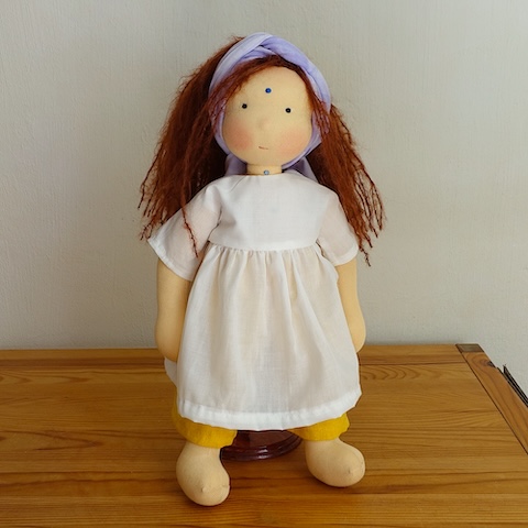 Die Puppen sind 40 bzw. 30 cm cm groß. An ihren Augen funkeln goldene Lachfältchen. Sie sind teilweise mit Granulat gefüllt. Dadurch liegen sie angenehm schwer in den Armen und können gut positioniert werden. Ihre Kleidung besteht aus einem Kleid aus weißem Musselinstoff, beigen Hosen aus dem gleichen Stoff, Engelflügeln und einem goldenen Haarband.