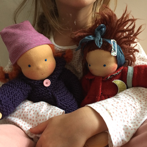 Mit einer einzigen leibhaftigen Begegnung hatten wir unsere virtuelle Neugier aufeinander in eine Freundschaft mit echter Verbundenheit verwandelt. Dass wir uns erst Jahre später wiedersehen würden, machte uns nichts aus, denn wir hielten Kontakt und fühlten einander nahe. (Nahe sind sich übrigens auch Fanny und Lotte, die damals angefertigte Puppe, deren Kleidung, die ab und zu von Salut dem Bären getragen wird, es sogar in Okkas aktuelles Buch „Herdwärme“ schaffte). Als Okka wieder Mutter wurde, war klar, dass wir unseren Puppennähtag wiederholen würden. Auch Hedi sollte eine selbstgemachte Begleiterin bekommen.